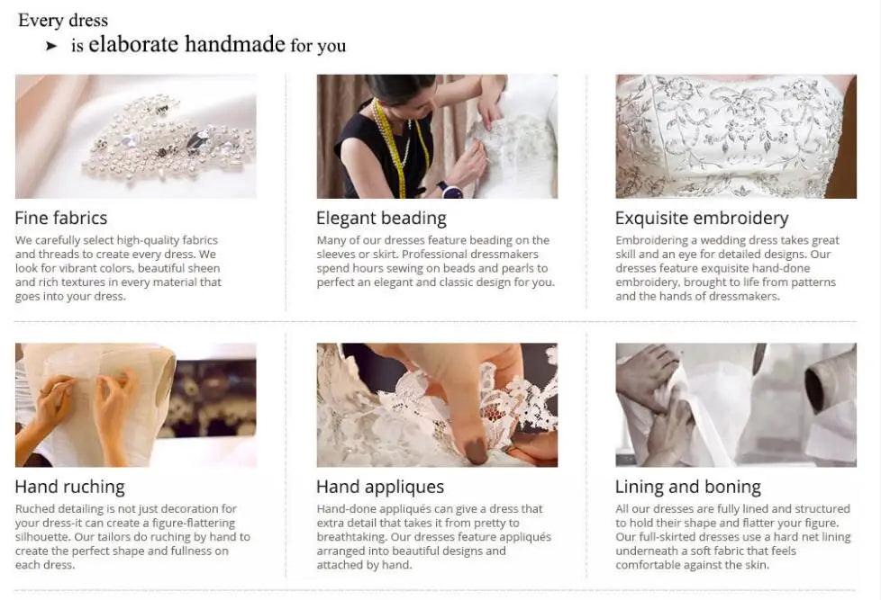 We carefully select high-quality Materials to create every dress,such as Satin, chiffon, taffeta, tulle, organza, velvet etc.We are trying our best to meet client's requirement.