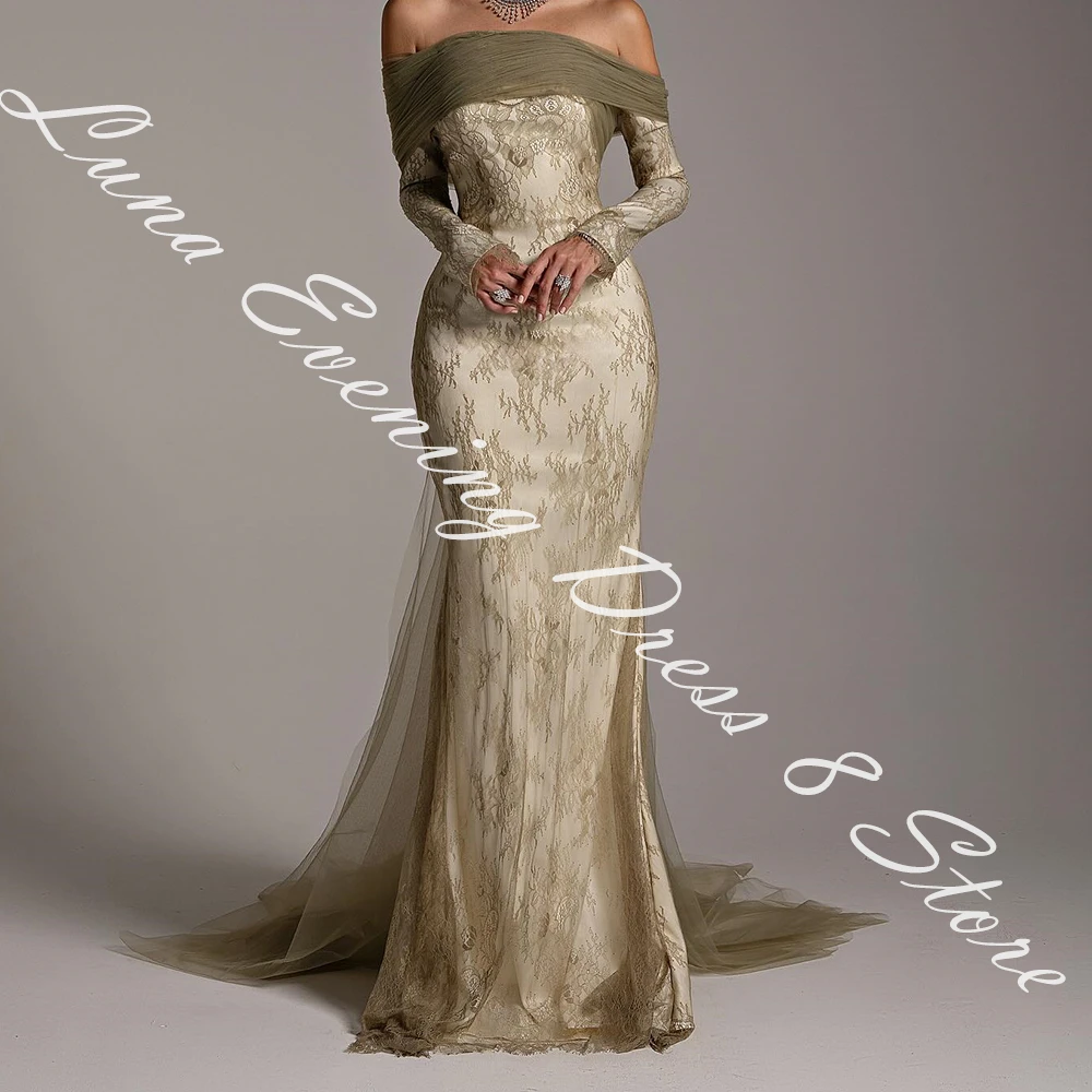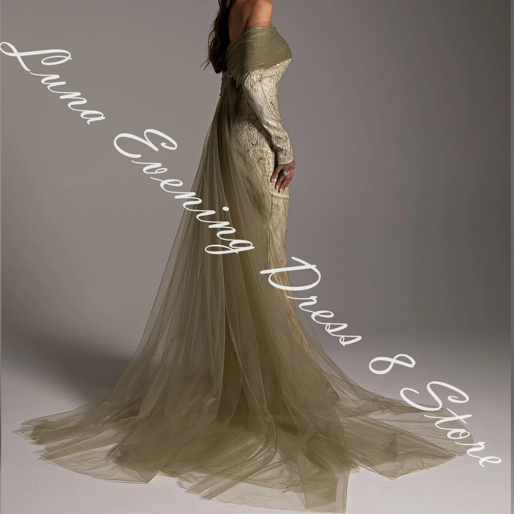 Customized Classic Tulle Mermaid Off the Shoulder Evening Dress Strapless Floor Length Long Sleeves Panel Train Photo