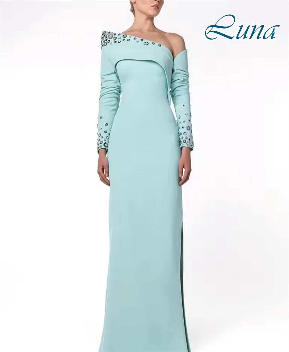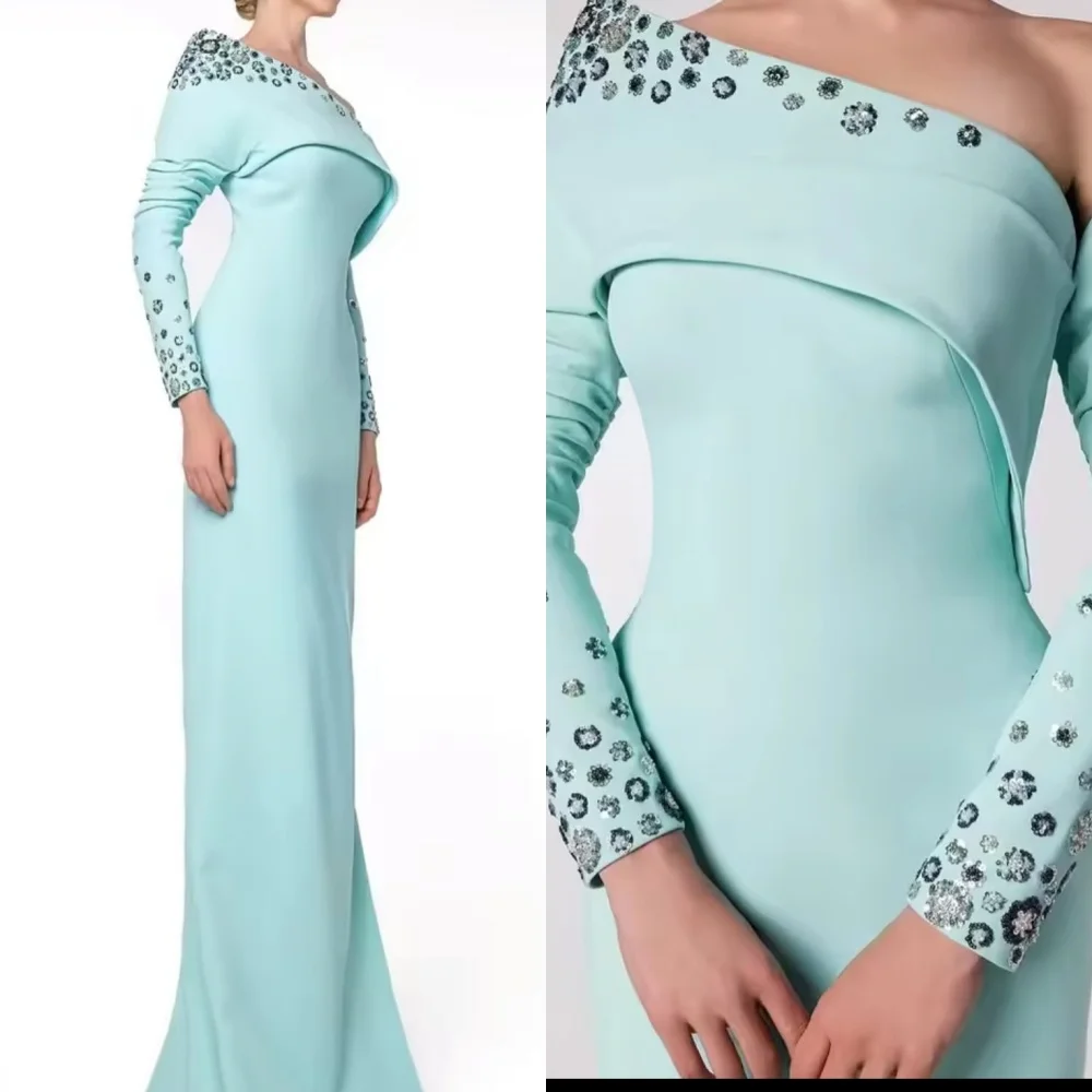 Customized Exquisite One Shoulder Long Sleeves Evening Dress High Quality Satin Prom Dresses Delicate Crystal Party Gowns