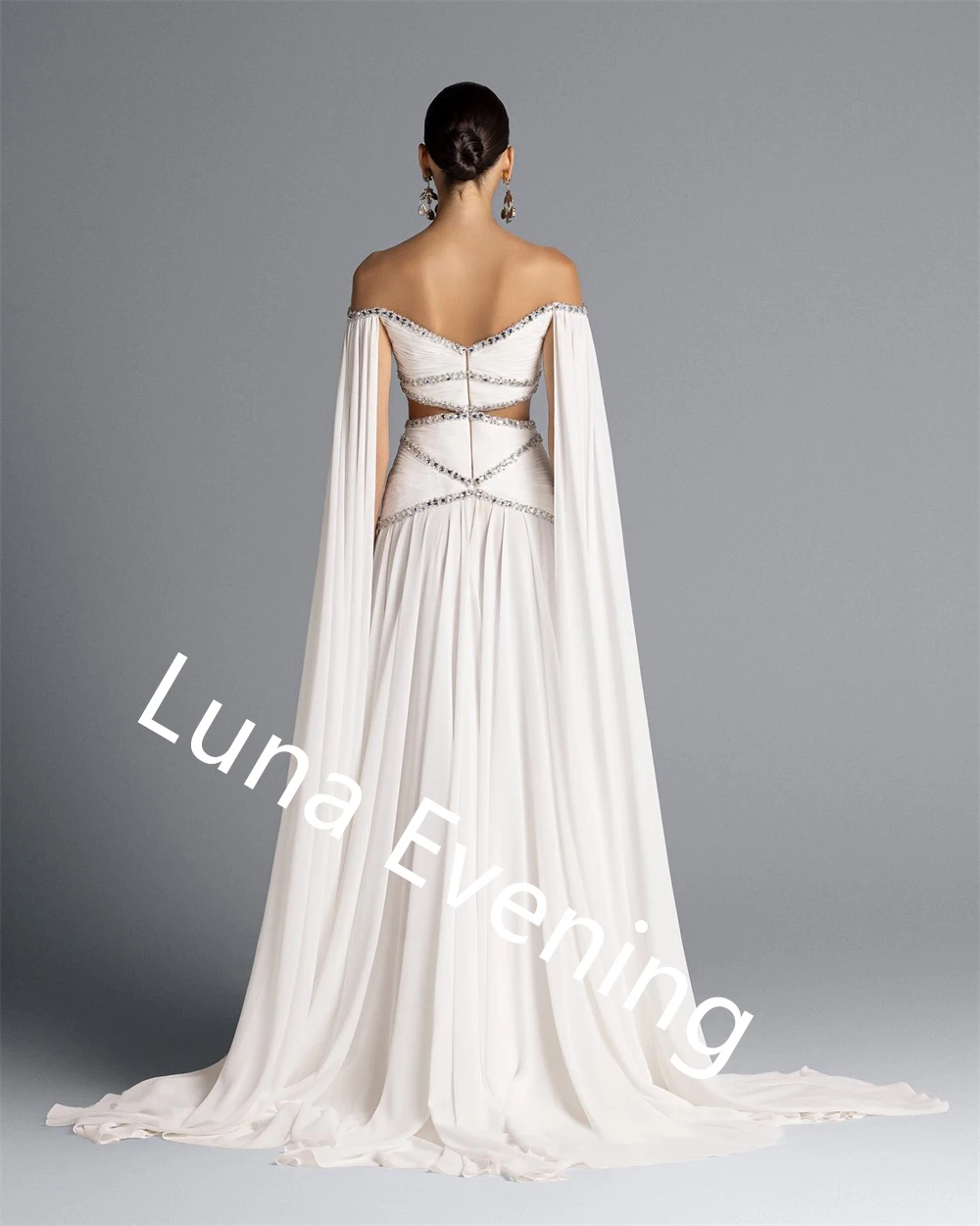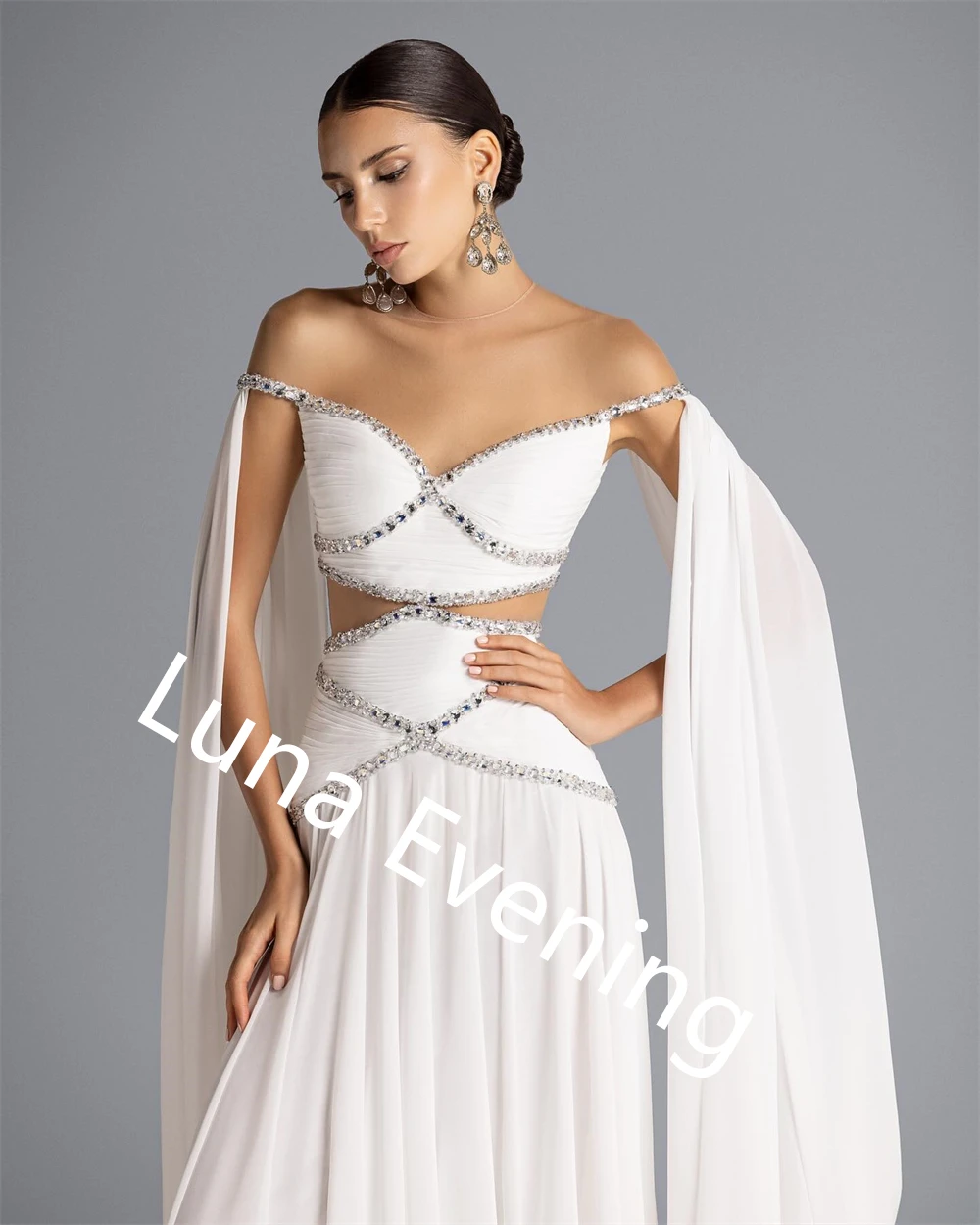 Customized Temperament White Chiffon Evening Dress Boat Neck Off the Shoulder Sleeveless Celebrity Gowns Crystal Part